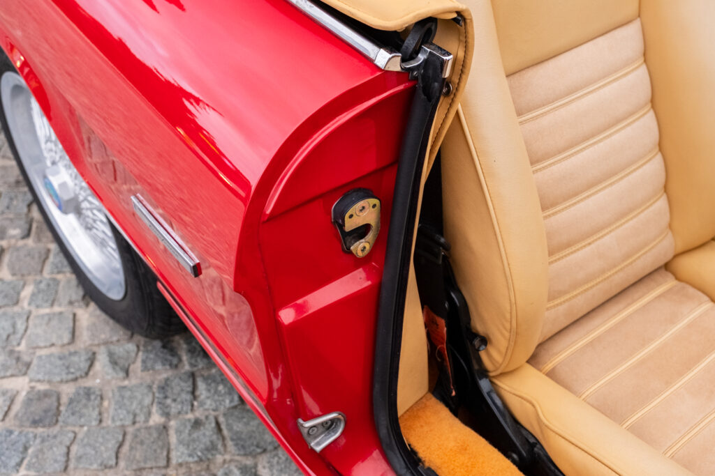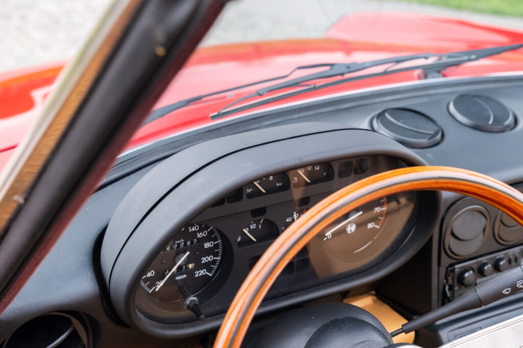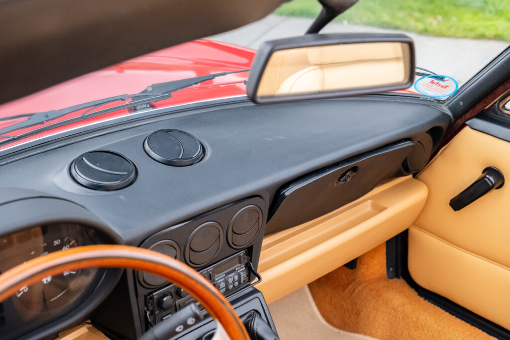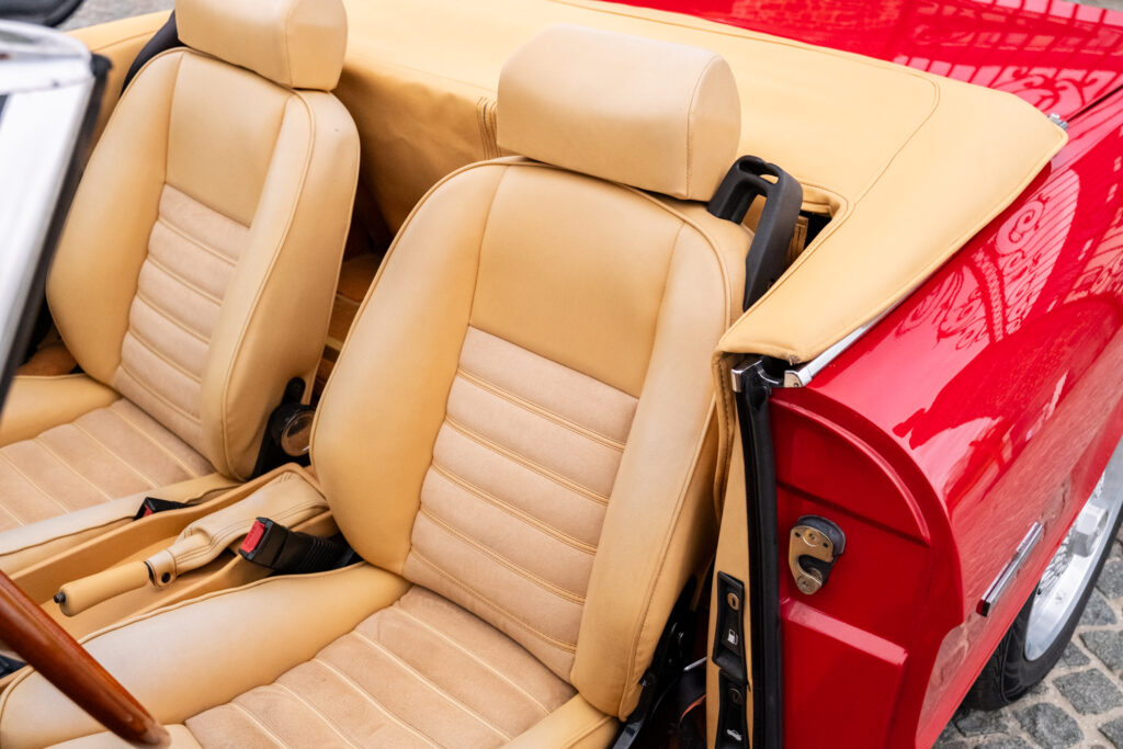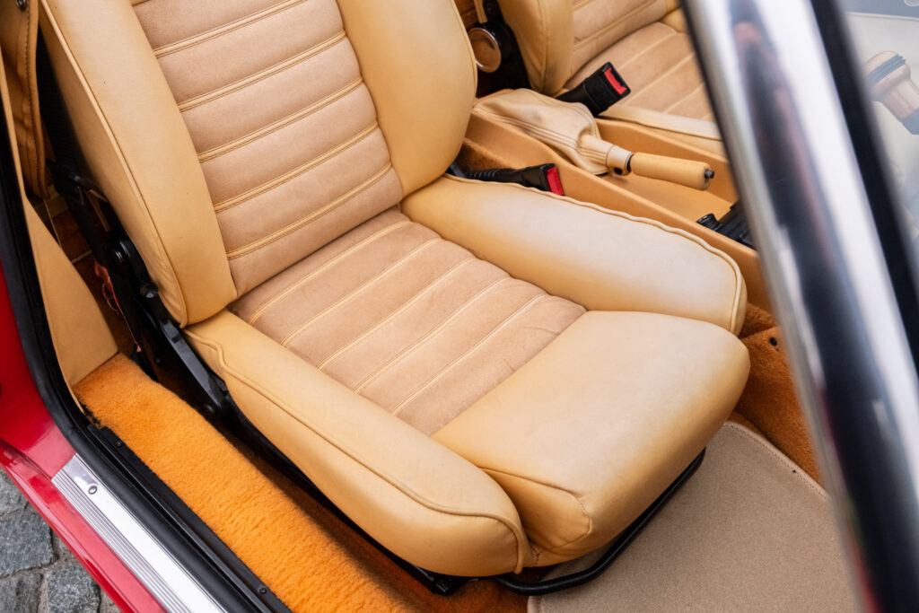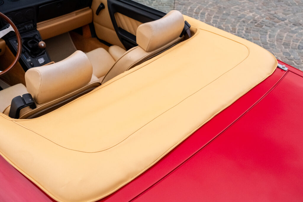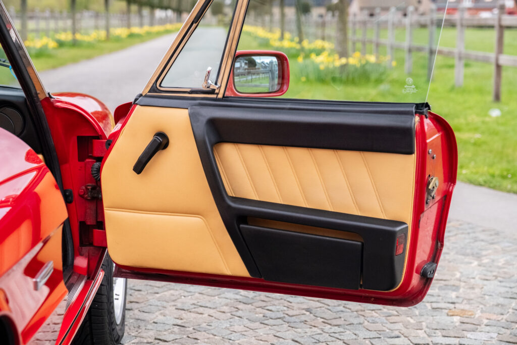 Deze wagen is uitgevoerd in het iconische Rosso Alfa 130 met een stijlvol beige interieur – een tijdloze en bijzonder elegante combinatie.